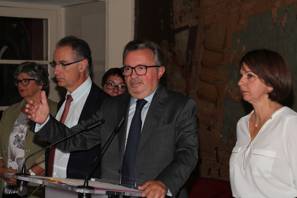 Jean-Noël Guérini est intervenu au centre Fleg en présence de Michèle Teboul, présidente du Crif et Zvi Ammar, président du consistoire (Photo Robert Poulain)